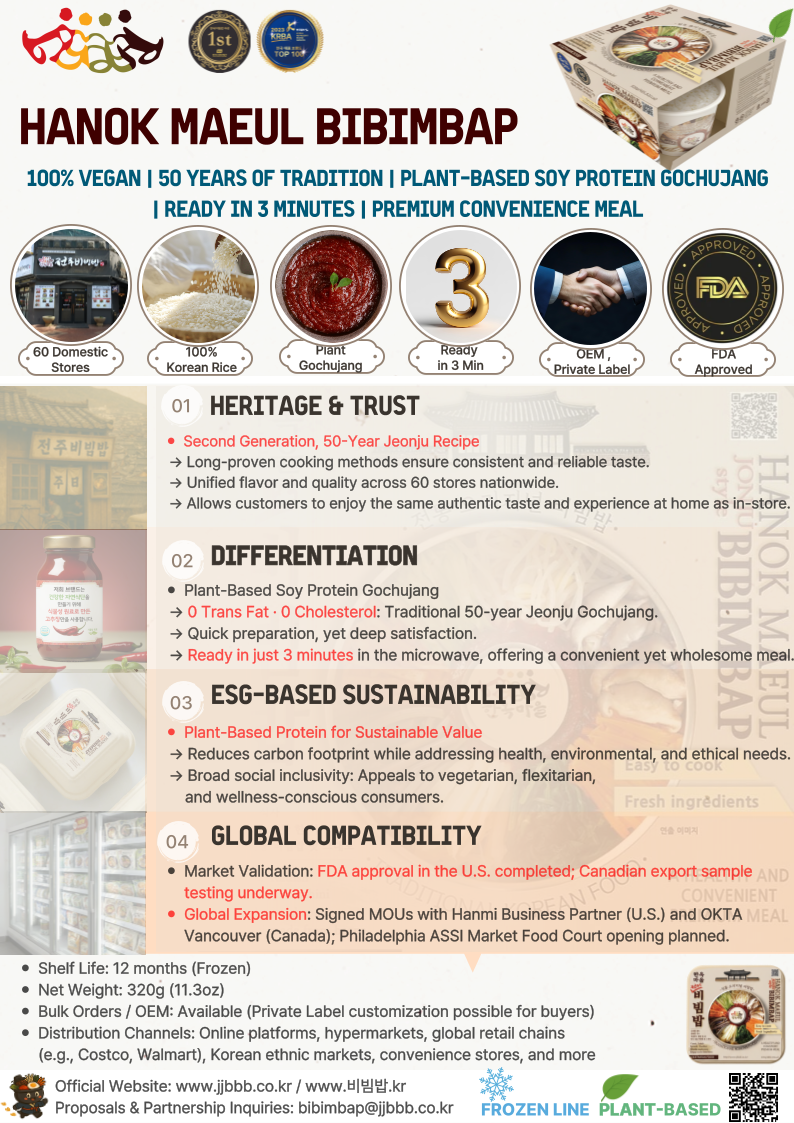 Hanok Village Bibimbap is also strengthening its global presence with the launch of the frozen product. In December 2025, it will open at Glenview Food Court in Chicago, followed by entry into Philadelphia’s ASSI Market in February 2026. Exports to Vancouver, Canada, are already underway, broadening the reach of the brand across North America.
